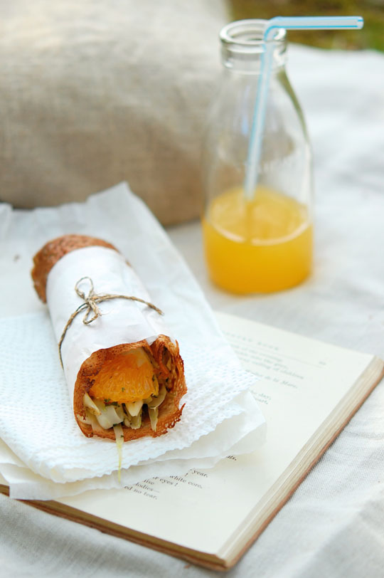 Fill the crêpes with the following salad, roll and wrap in paper and secure with hemp thread.